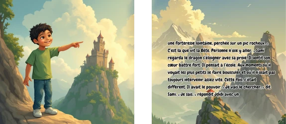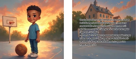 Chaque scène est conçue pour suivre le rythme de l’histoire et renforcer les émotions du texte. Le visage réel de votre enfant intégré à un univers imaginaire entièrement personnalisé, directement sur la couverture du livre